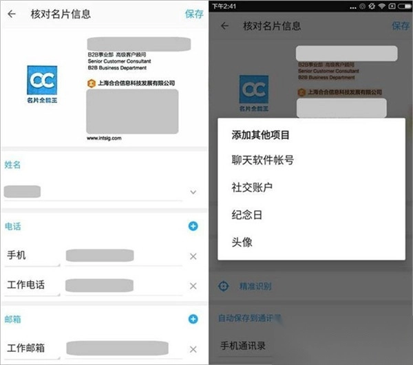 名片识别之后,您会看到名片信息校对的界面,您可以在此界面选择将名片信息保存到手机通讯录,您的选择会被记住,因此无需每次都进行该选择。