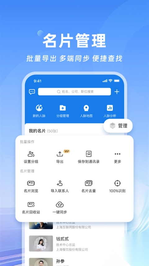 扫描保存的所有联系人,登录账号可实时同步到云端,安全备份永不丢失,换手机掉手机不担心,人脉丢不了。