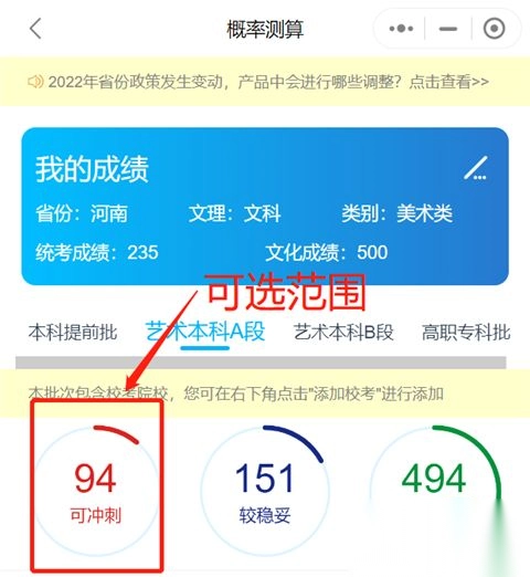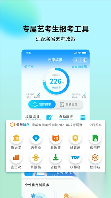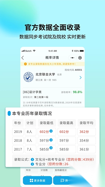 依托艺术类定制的数据分析模型,并融入超十载艺考指导专家的经验,能够精准预估录取几率,其准确度可达99.8%。助力考生充分发挥每一分的价值,从而考上更优质的院校。同时,还具备文化分换算、冲刺与保底院校概率分析、统考校考录取情况对比等实用功能。
