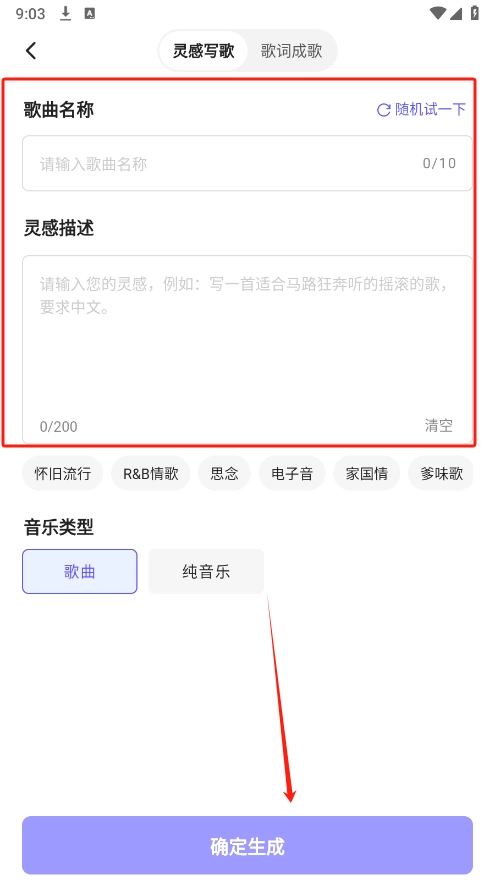 5、音乐页面设有灵感写歌、填词成曲等功能,只需输入歌曲名称、描述内容等信息,就能快速生成。
