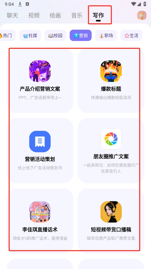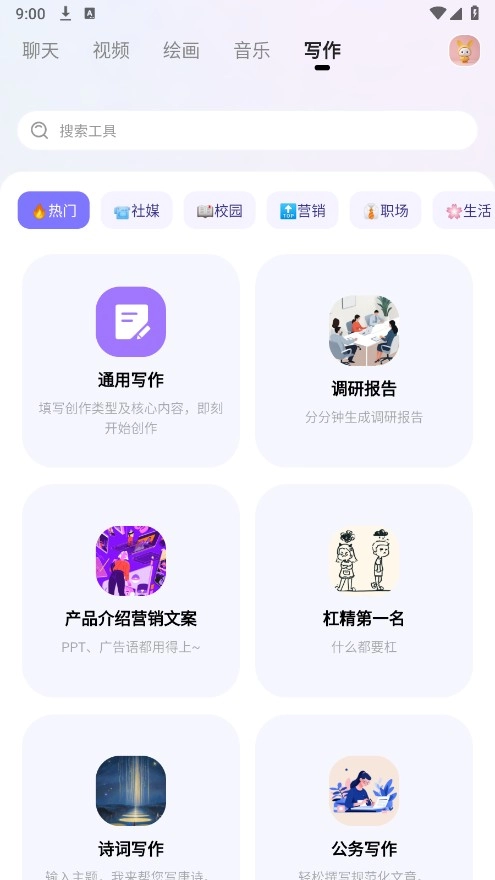 6、点击“写作”,在此处,为大家准备了极为丰富的写作功能,像诗词写作、文案标题创作、演讲稿撰写等,大家依据自身需求挑选就行。