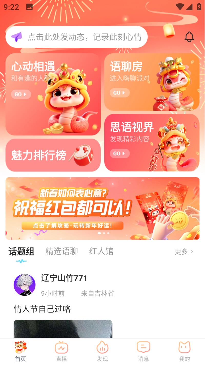 思语App是深受当下年轻人喜爱的聊天交友软件。它既能作为与好友通讯聊天的工具,又能帮你结识众多好友,还提供直播观看功能。这款软件内容极为丰富,每日都会带来全新内容。无论是情感困惑、事业难题,还是人生哲学思考,你都能在此找到倾诉对象。而且,还有大量直播间供你自由选择加入。