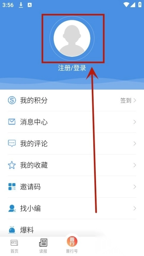 1. 下载、安装山西晚报app,随后打开该应用,进入首页后,点击【我的】