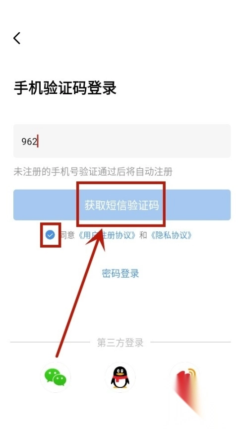 3.输入手机号,勾选隐私协议,点击获取验证码就可以自动注册登录了