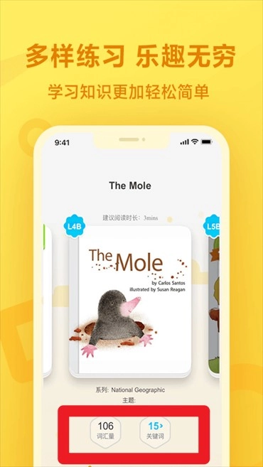 3、每篇阅读材料下方均会标注词汇量与推荐时长,以便孩子能够有计划地进行练习。