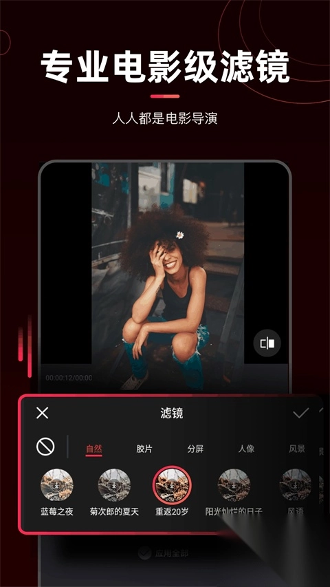 1、多样滤镜:自然,胶片,人像多种滤镜,每个视频都能美美哒。