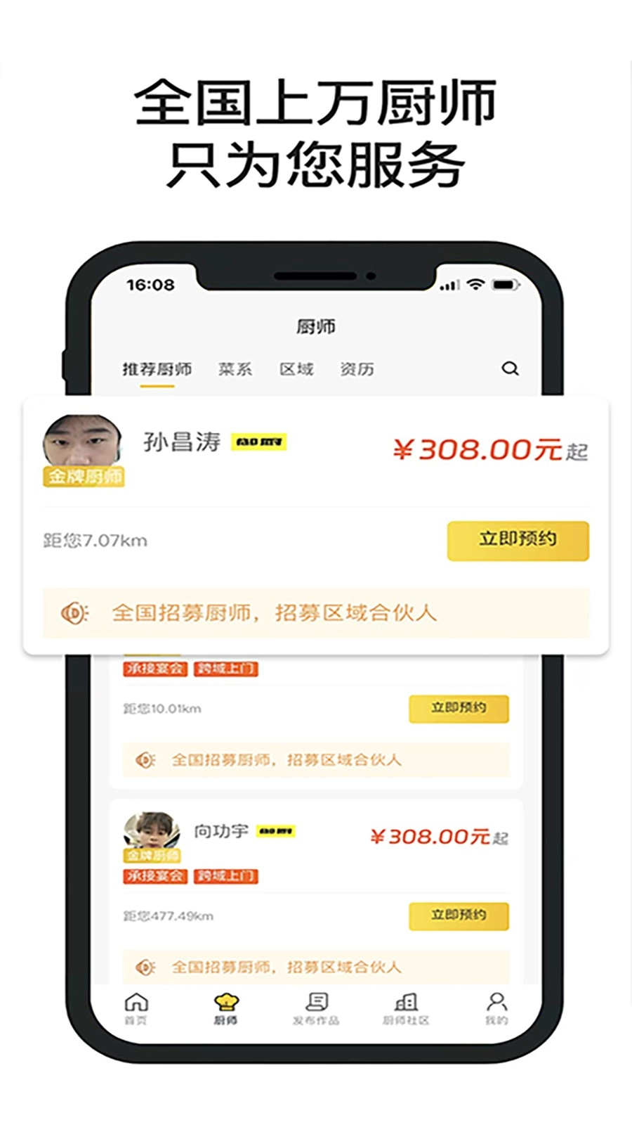 1、预约厨师是主要功能,选好时间地点就行。师傅会提前联系确认菜单。