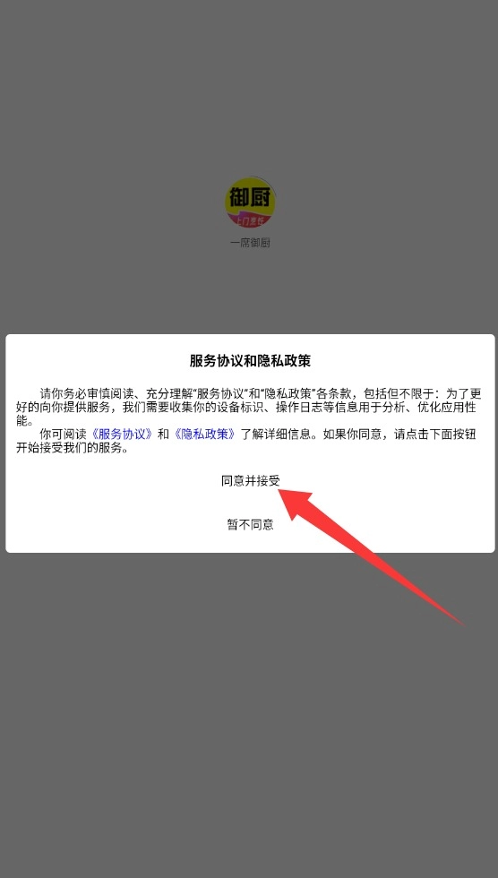 1. 打开一席御厨APP,认真阅读用户协议,随后点击“同意”按钮,进入登录页面。