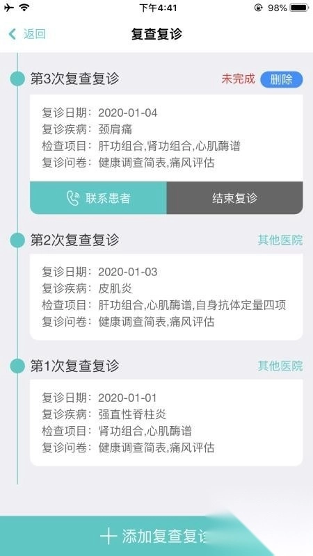 为了更好地管理每一位患者,患者的复查复诊记录可通过复诊界面进行添加。
