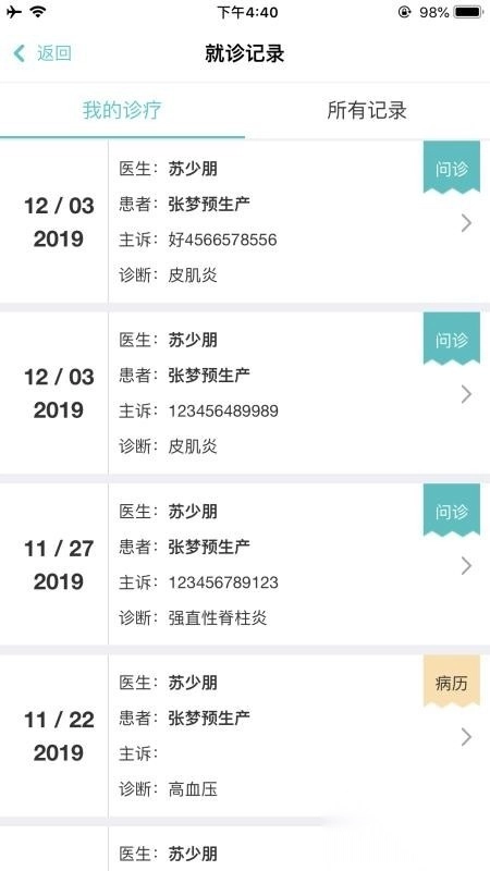历史为患者提供的就诊记录以及就诊的聊天信息都可以查看到;