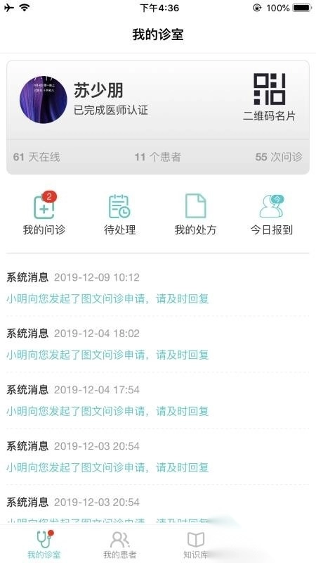 3、在当前界面可以实时获取到系统发送的患者问诊提醒