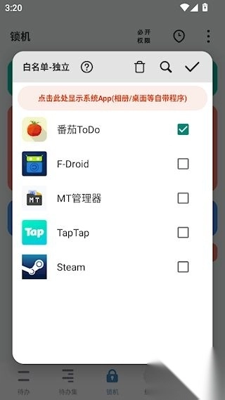 2、勾选需要加入白名单的应用,点击右上角的按钮保存