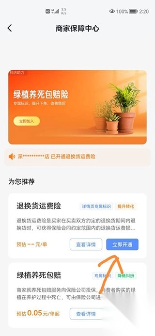 3、在“商家保障中心”中点击“退换货运费险”处的【立即开通】即可。