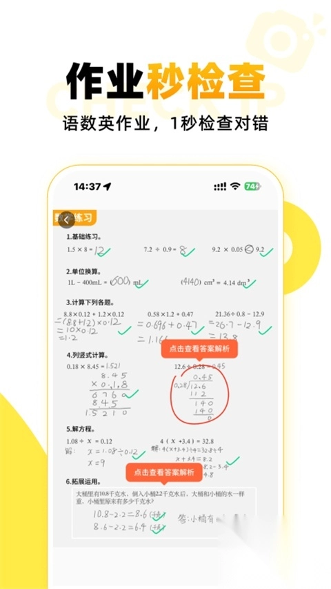 2、题型丰富,精准批改:涵盖口算题、竖式计算、单位换算、选择题、判断题、应用题、填空题等多种题型的检查,具备高准确率。