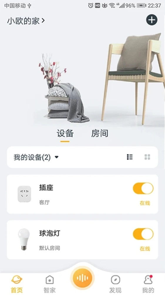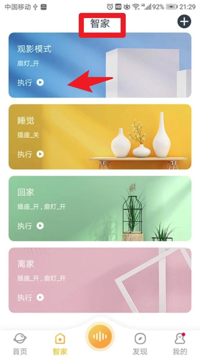 4. 在「智家」页面可一键执行设定好的场景联动,如回家自动开灯、离家关闭插座等。