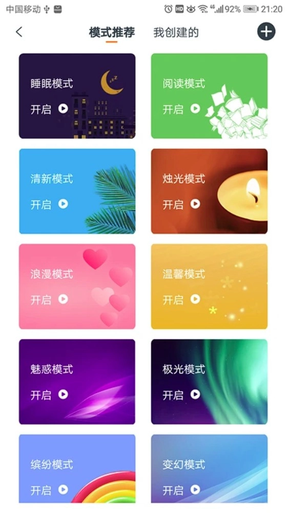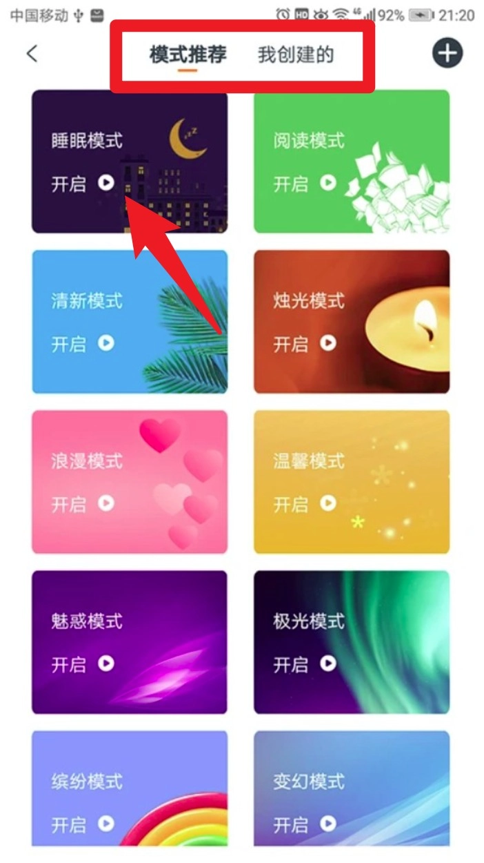 2. 成功登录后,于首页点击「模式推荐」标签,挑选心仪的模式,例如睡眠、浪漫或极光等。