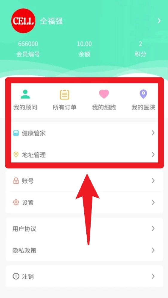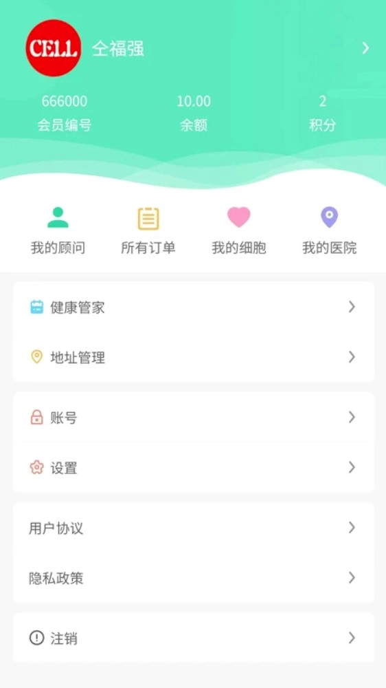 5. 在「我的」页面,可以查看顾问信息、订单记录、我的细胞及进行地址管理等个人中心功能。