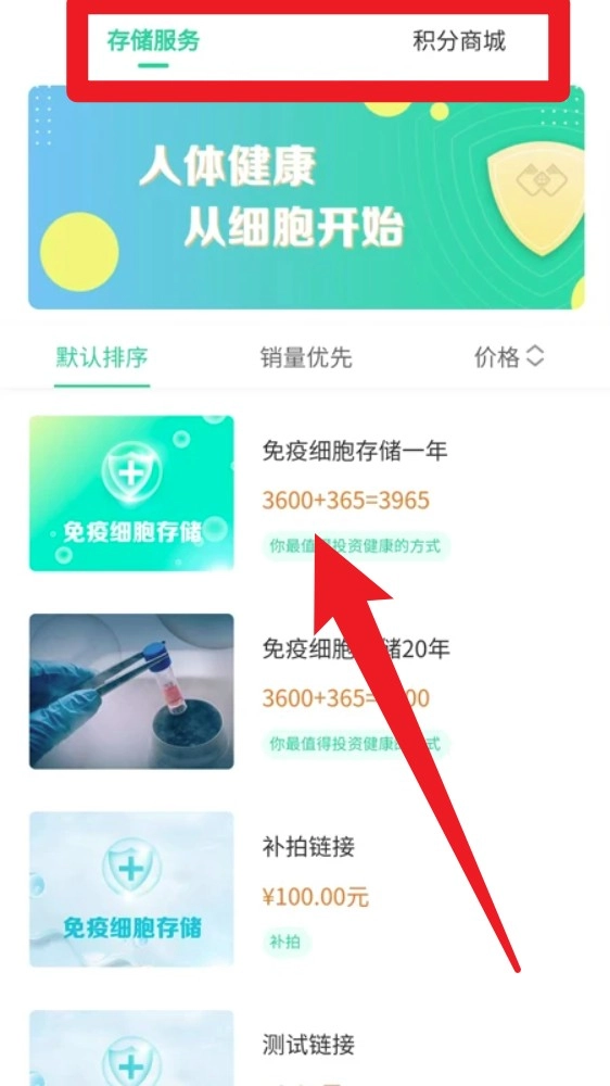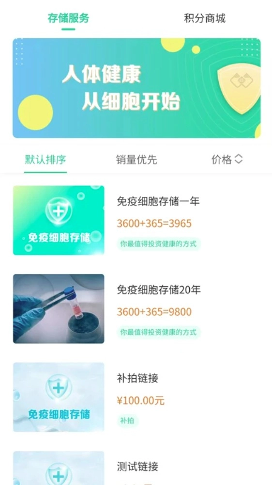 4. 点击「存储服务」标签页,浏览并选购不同年限的免疫细胞存储产品套餐。