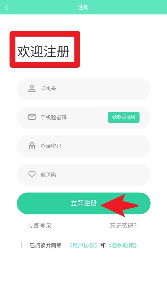 1. 进入注册页,填写手机号、验证码及密码,点击「立即注册」创建细胞库账号。