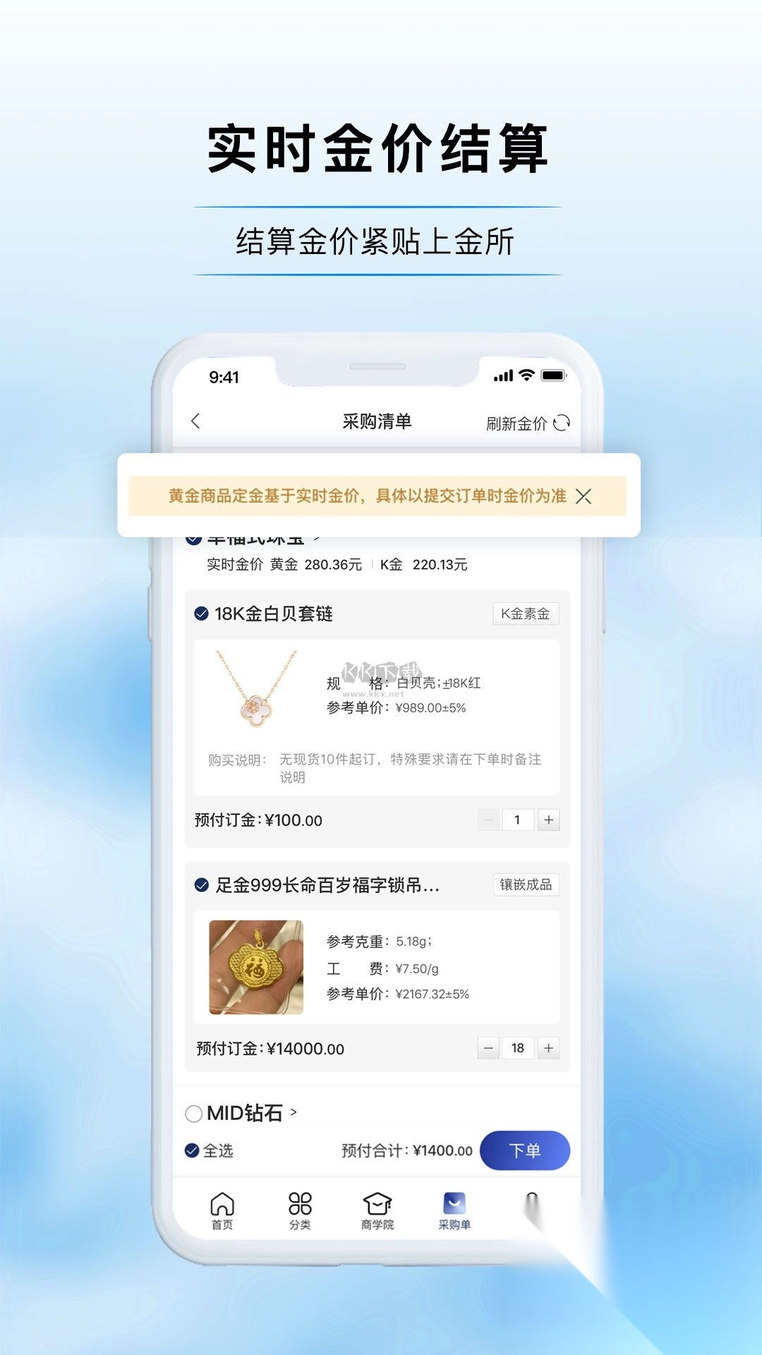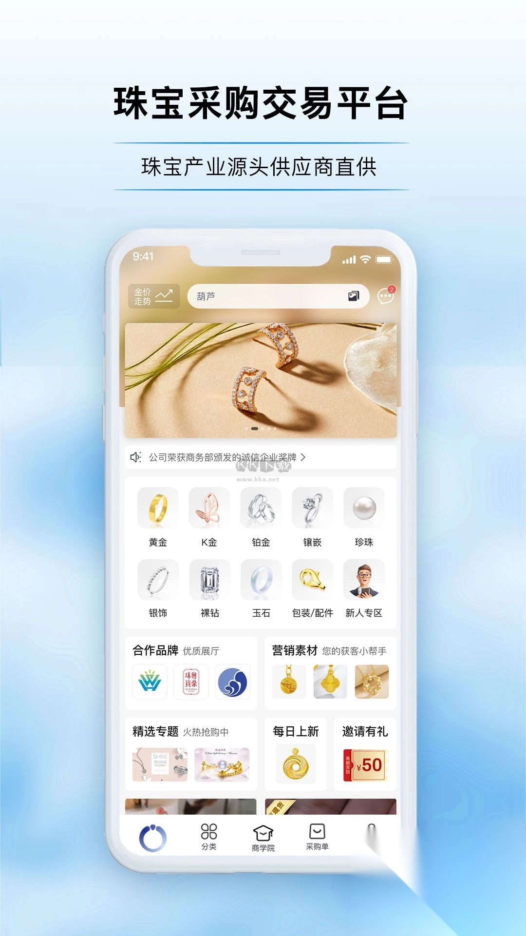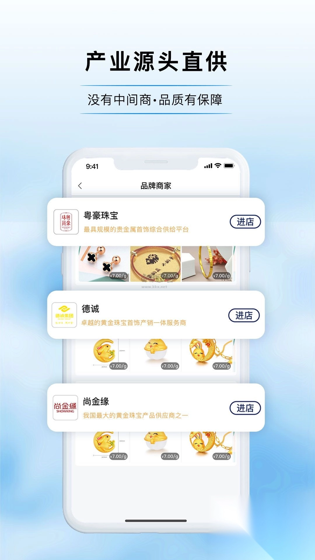 4、特别为黄金珠宝零售企业、门店以及个体户等老板精心打造全网独一无二的黄金珠宝一站式批发采购平台。平台拥有海量商品,提供实时金价信息,还支持在线结算。
