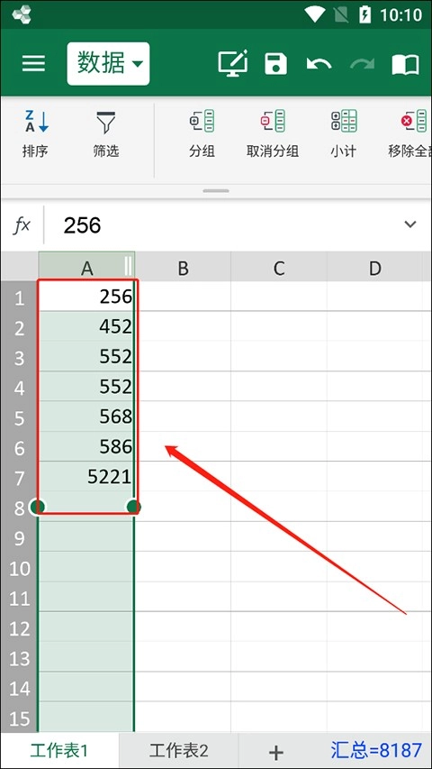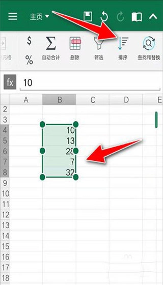 4、在单元格添加一列数字并选中,再点击APP界面上的"排序"菜单(小编比较懒,所以就简单的随便输入几个数字了哈)。