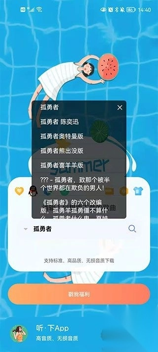 听下App,一款聚合全网音乐资源的播放神器!它整合了众多平台的歌曲库,用户无需在多个音乐平台间来回切换,只需在这一个应用中,就能畅听各大音乐平台的丰富曲目。无论是周杰伦、林俊杰的经典老歌,还是当下抖音热歌、最新发布的单曲,都能一键轻松找到。不仅如此,它还支持无损音质播放,音效清晰流畅,给你极致的听觉享受。你还可以自定义下载路径,方便离线收听,想听就听。其界面简洁,操作易用,搜索功能更是强大无比。如果你热爱听歌,那就别再犹豫,赶快下载体验吧!