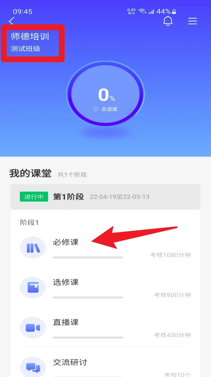 3. 点击进入某个培训项目后,可查看阶段任务,如必修课、选修课与直播课等,进度环清晰展示完成百分比。