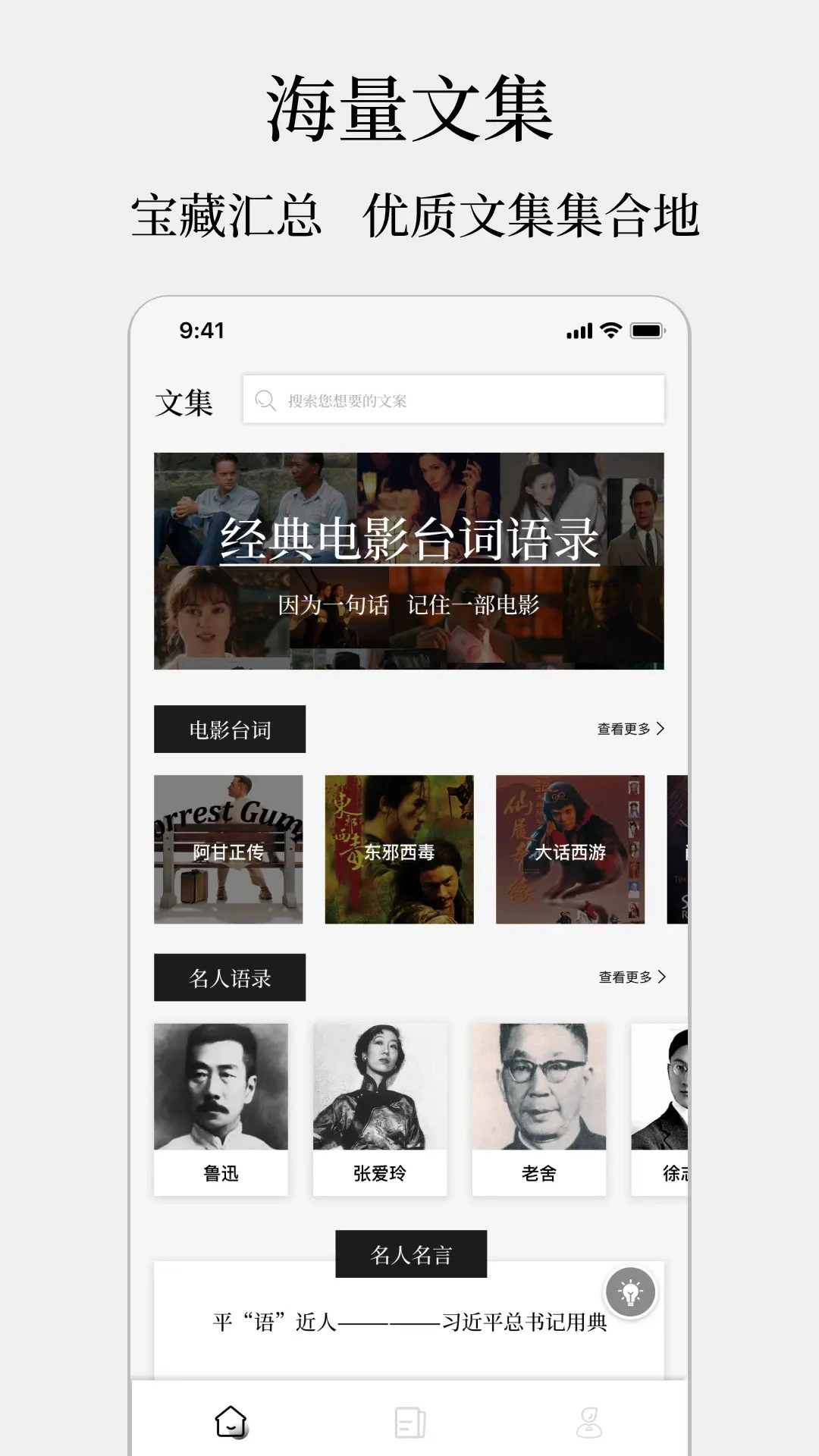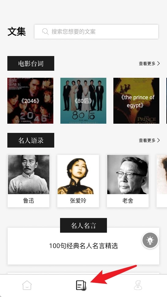 3、文集页面集合了电影台词、名人语录等各类精选内容,借助搜索关键词,能快速定位所需的文案资料。