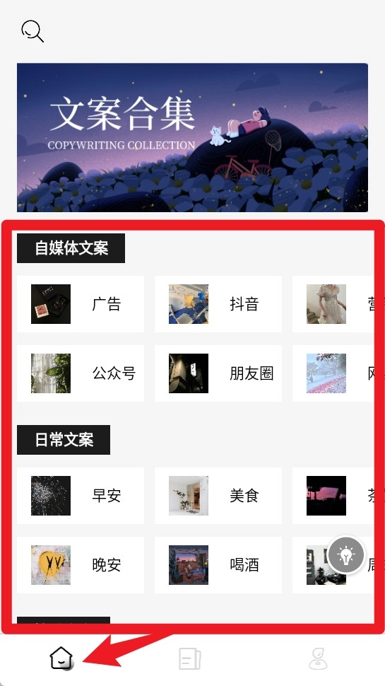 1. 首页呈现多样化的文案分类内容,涵盖广告、抖音、公众号等类别。用户能够依据自身需求,迅速浏览并点击以查看详细信息。
