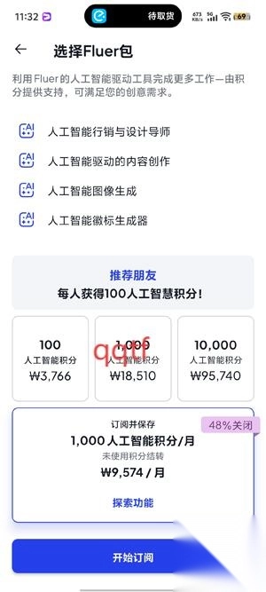 开启你的FluerAI设计程序,进入主页后,轻点右上角的“订阅”选项,随后在弹出的窗口里,点击“获取更多积分”按钮。