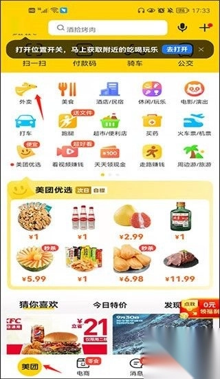 1. 首页专门设置了外卖专区,在此区域会呈现经过精心挑选的商家以及菜品,便于用户快速浏览。