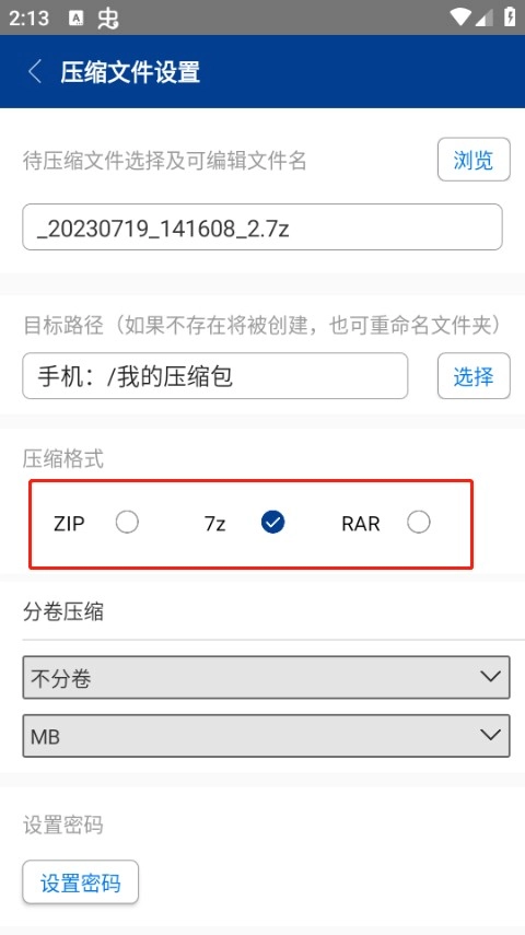 4、在压缩格式那里可选择你想要的后缀名,这里我选择了7z,往下滑点击确定即可完成压缩。