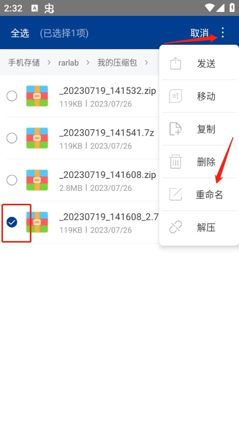 5、如下你就会看到刚刚压缩了的文件,点击右上角的编辑图标即可选中你要更改后缀名的压缩文件,点击右上角的三个小点,选择重命名。