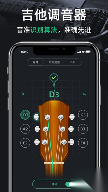 调音器guitar是一款极为实用的调音软件,它能自动聆听并识别调音内容。当用户弹奏乐器时,该软件会实时捕捉音高信息,随即给出准确的反馈。此外,这款软件支持多种乐器调音,并非仅适用于吉他,尤克里里、贝斯等其他乐器也在其适用范围内。
