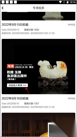 2、此处展示了众多专场列表,各专场拍卖的物品不尽相同,您可依据自身喜好挑选其中一个专场。