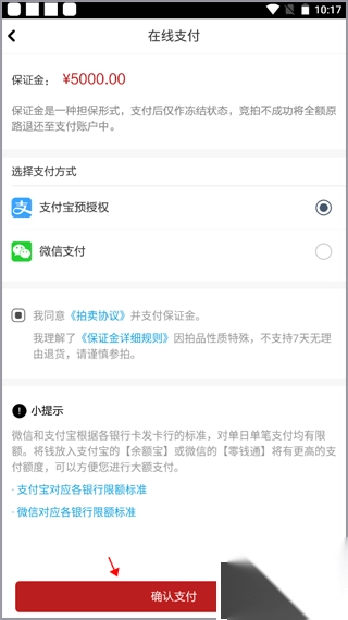 5、此保证金属于一种担保费用,专门用于竞拍环节。若用户未能竞拍成功,保证金将全额退还。点击下方“确认支付”,即可参与竞拍。