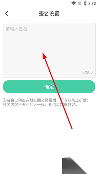 2、登录成功后,点击签名设置,可输入签名,且签名会自动加在朋友圈文案最后,可有效防止折叠;