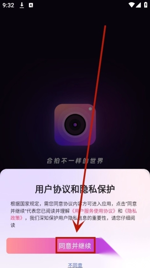 先下载并安装萌影相机app,安装完成后打开该应用。进入应用界面后,点击“同意并继续”选项,同时也就意味着同意了隐私政策。