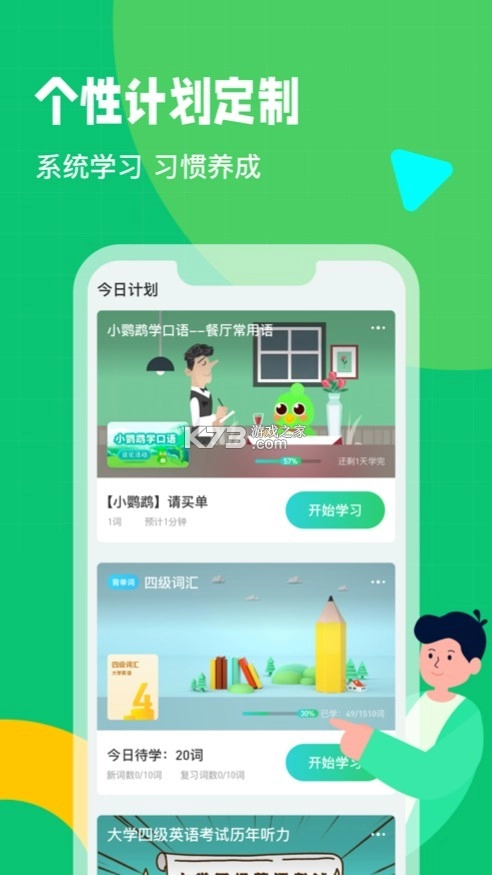 通过为单词、字母、发音、语法、拼读等多模块建立学习计划,完成每日目标。