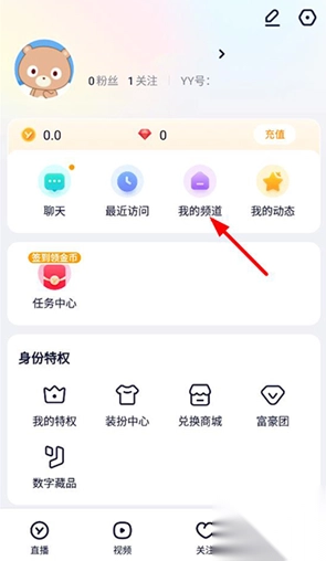 1、打开进入yy语音手机版,在“我的”页面内点击“我的频道”