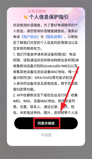 请在个人信息保护指引提示界面,点击“同意并继续”选项。