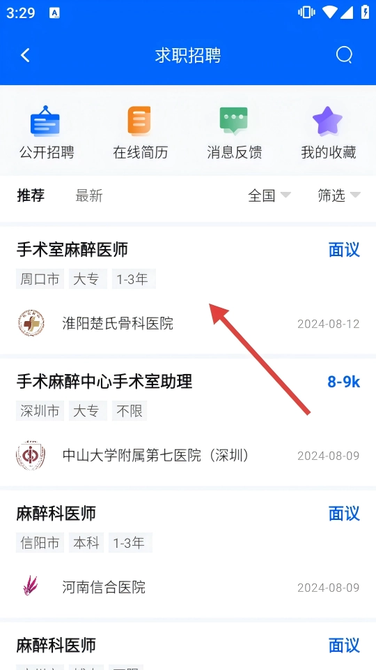 2. 在招聘列表里,挑选【手术室麻醉医师】等心仪岗位,查看其职责、要求以及发布信息。
