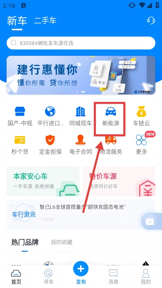 1、打开APP首页,点击【新能源】图标,进入新能源汽车列表页面。