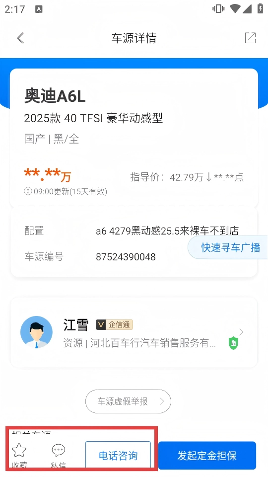 4、在车源详情页面,可以点击底部的【收藏】【私信】【电话咨询】按钮,了解车辆详情。