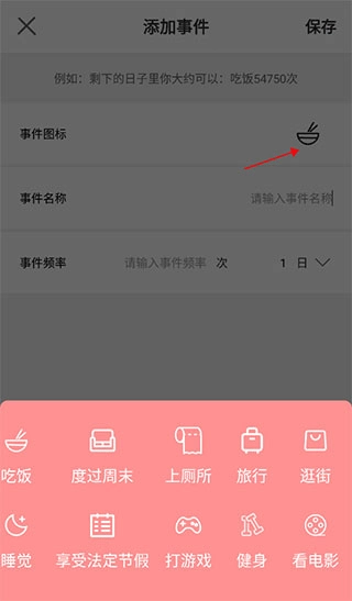 7、挑选吃饭、健身、睡觉以及看电影等事件图标,设定事件名称与提醒频率,点击保存即可。