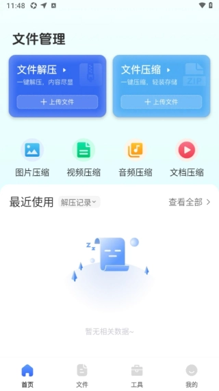 1、软件中既能看到文件解压功能,也能看到文件压缩功能,它们都被放置在最为显眼之处。这里的文件涵盖图片、视频、音频、文档等各类内容,同时还能查看历史解压记录。
