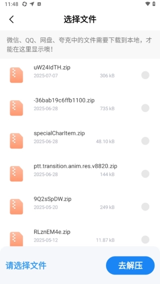 2、当你有需要解压的文件时,直接点击文件解压,手机中的压缩包便会展示出来,一键选择即可完成解压。