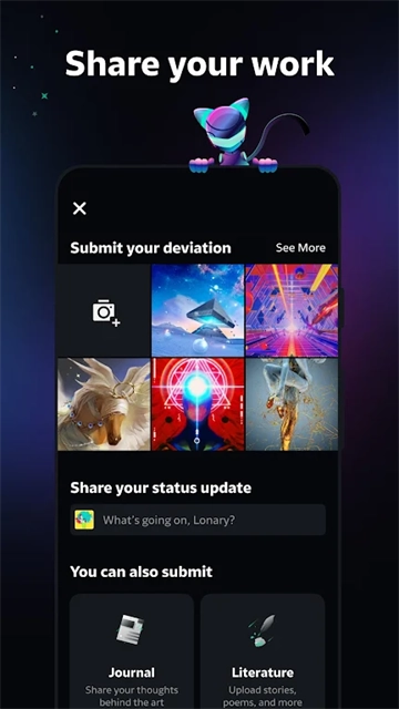 1. 在作品展示与分享领域:可以上传数字插画、摄影、3D建模、文学等各类作品。