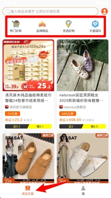 1. 首页设有热门好券、品牌精品以及天猫国际等便捷入口,便于用户快速寻觅心仪好物。