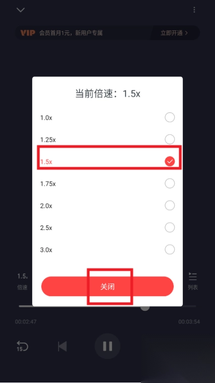 要成功修改,选择倍速后点击关闭即可。